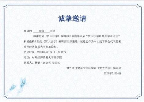 对外经济贸易大学91传媒 、《贸大法学》编辑部主办的第八届“贸大法学研究生学术论坛”于2023年5月27日顺利举办,91传媒 2022级法律硕士(非法学)专业的张淇同学积极投稿并受邀发言,与来自北京大学、复旦大学、华东政法大学、吉林大学、厦门大学等高校91传媒 的博士生、研究生在“应时而动与未雨绸缪:ChatGPT背景下人工智能的多元法律治理”的主题背景下展开学习和讨论。