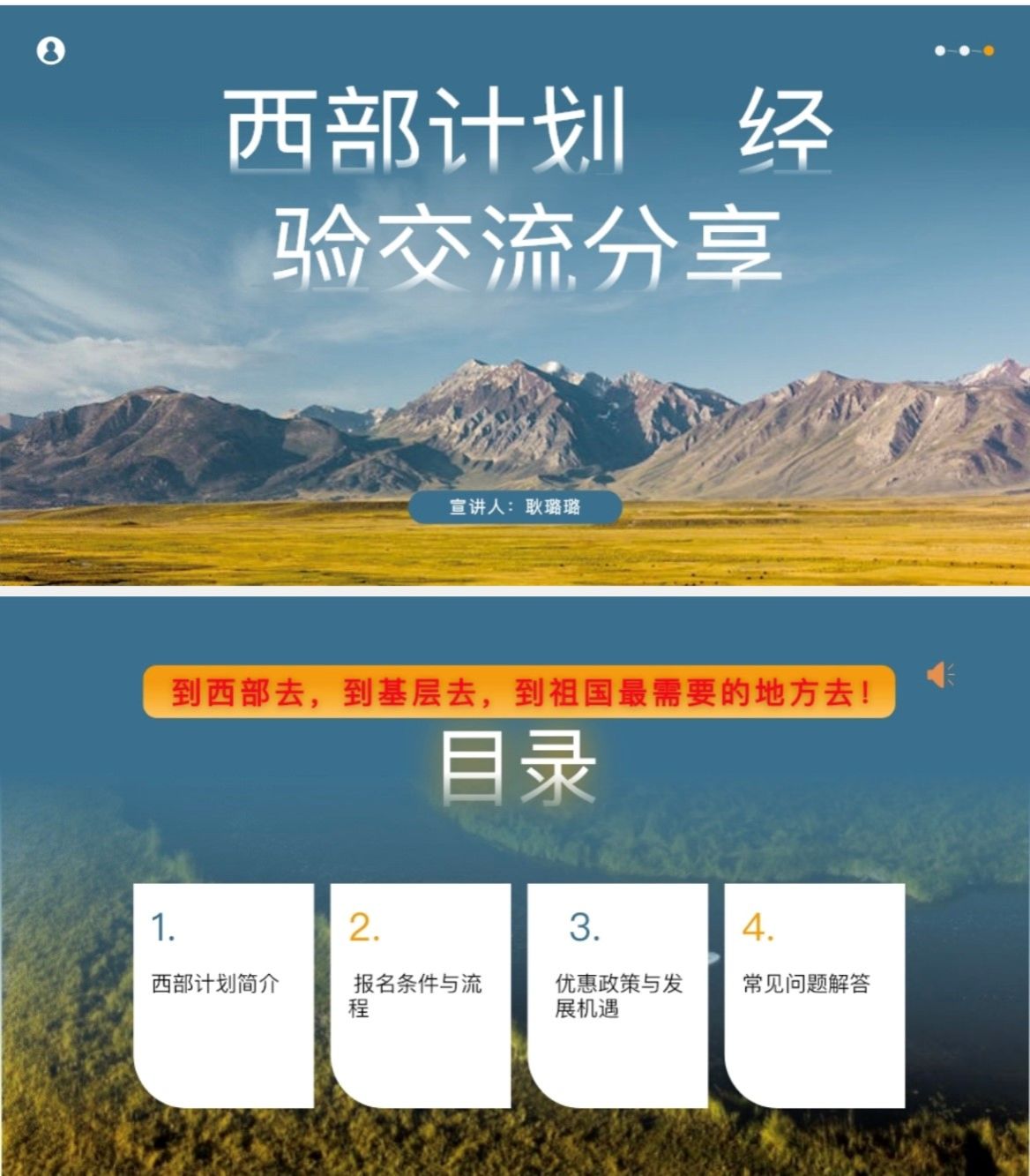 随后,库尔勒市政法委员会志愿者陈锦龙,以“报考初心与基层淬炼”为主题,细致讲述了关于西部计划报考、准备、单位选择方面的内容。陈锦龙强调西部计划为青年搭建了广阔舞台,国家给予了志愿者诸多政策支持,涵盖升学加分、公务员考试优待、就业创业帮扶等各个维度,鼓励有情怀、有理想、有担当的青年学子积极报名,踊跃加入西部计划,在西部的广袤天地书写属于自己的青春华章。