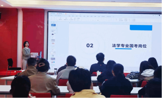 讲座伊始,付蓉老师围绕法学专业就业现状进行了深入剖析,通过详实的数据与清晰的图表,直观展示了法科毕业生主要就业去向,涵盖国内律师事务所、外资律所及工商企业等多个领域。在全面梳理当前就业形势后,付老师聚焦公务员招录政策,系统讲解了公职岗位的报考条件、选岗策略及备考路径。