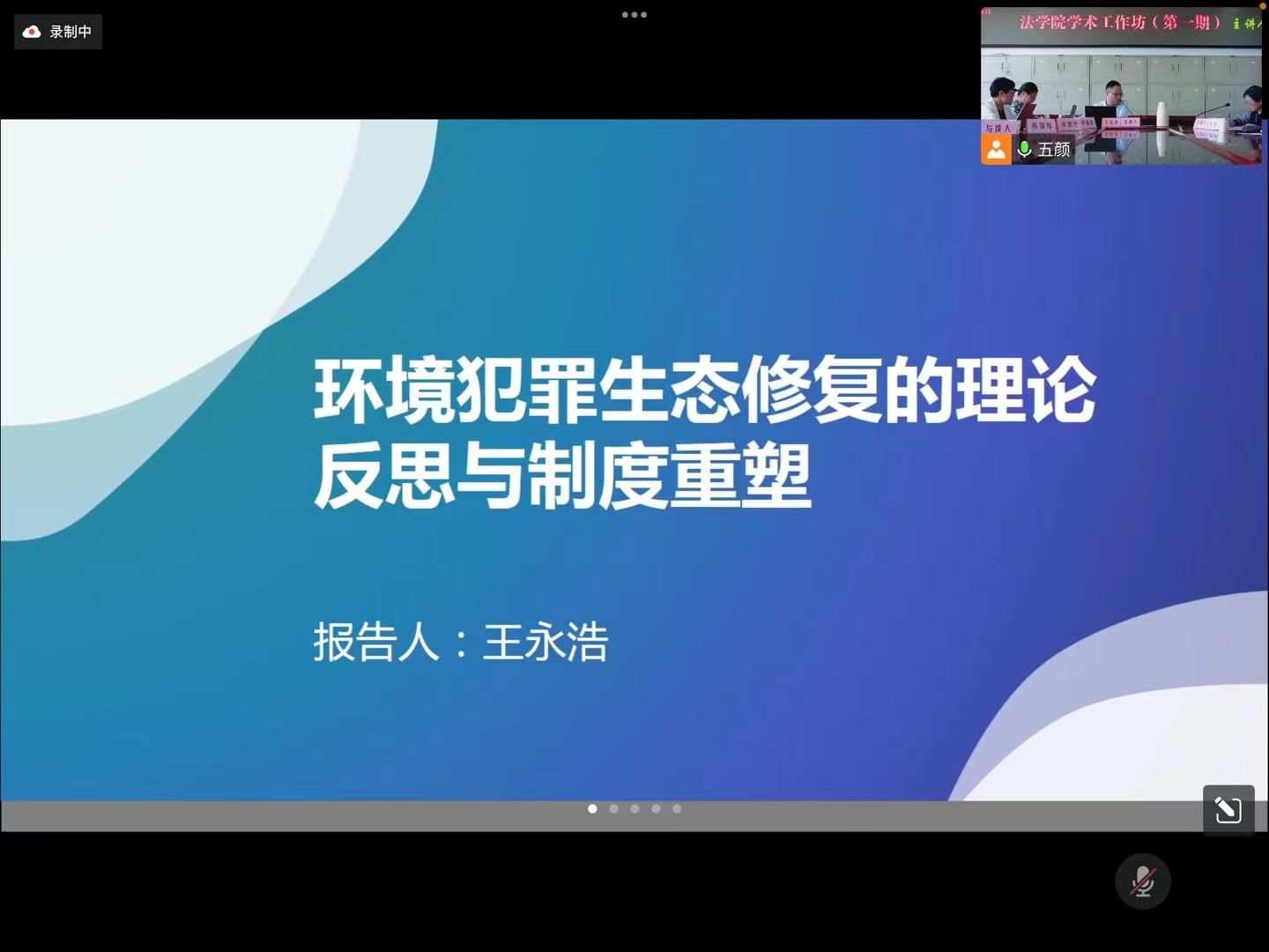 随后,王永浩老师就发言主题从选题来源、实务现状、研究现状、主要观点和环境犯罪治理的破局五个角度阐释了当前在环境犯罪生态修复领域的前沿问题,着重强调了在环境犯罪治理过程中,应当打破环境侵权法、环境行政法和环境刑法三个部门法各自为战的局面,并基于整体环保主义的立场将实现环境修复与保护机能作为整体环保法的优先价值,如在三个部门法责任承担体系中引入生态修复激励机制以促进环境犯罪行为人积极修复生态环境,推进环境资源类案件统一管辖的三审合一模式等。