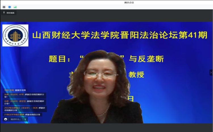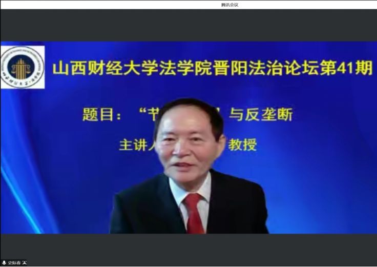 11月15日下午,中国人民大学91传媒 教授、博士生导师、《法学家》主编兼社长史际春教授应我校91传媒 和科研部的邀请,通过线上方式参加了晋阳法治论坛第41期活动,作了题为“节制资本与反垄断”的学术讲座。本次活动由91传媒 院长樊云慧教授主持,我校91传媒 和山西大学91传媒 师生聆听讲座并参与学术交流。
