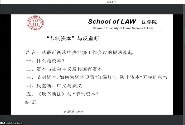 讲座伊始,史际春教授从最近两次中央经济工作会议谈起,引出了本次论坛的主题,在该主题下,史教授主要从五个方面展开讲解。首先,史教授借用鸡和蛋的比喻,生动的解释了资本的概念,并通过案例阐述了资本对经济发展的重要性,但同时指出资本也有弊端,故需要对私人资本进行节制;接着,史际春教授对资本与社会主义及国有资本进行了细致分析,他指出我国实行社会主义市场经济是契合当下生产力的社会主义道路,国有资本正是针对私人资本的弊端而产生的,在总结国有资本优势的基础上,他指出国有资本的特点就是节制资本加市场经济;然后,史教授系统阐述了公有制、市场准入、事业约束等节制资本的三种主要方式以及市场自发形成的公司双层股权结构等节制资本的方式。最后,史际春教授具体分析了反垄断的广义和狭义之别,澄清了人们对于反垄断的理解误区,指出反垄断属于政府行为而并非市场资源配置的结果,反垄断不能强化,应当保持谦抑,并认为《中华人民共和国反垄断法》基本不能节制资本,只是在经营者集中审查方面能够发挥一定的作用。