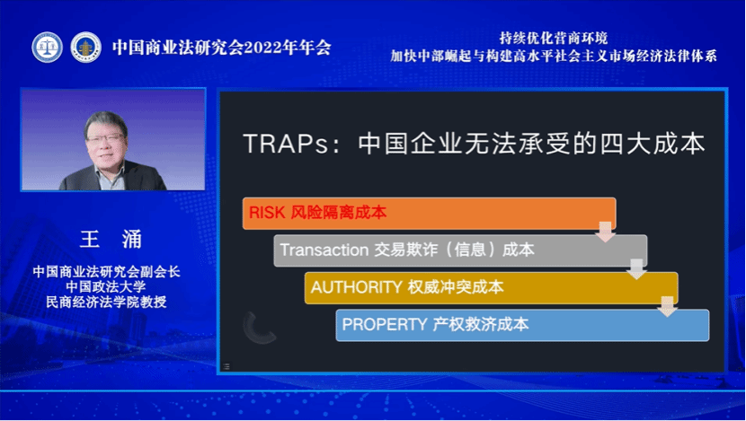 中国商业法研究会副会长、中国政法大学民商经济91传媒 王涌教授以“企业成本与公司法”为主题,展开论述了中国企业所面临的四种企业成本,并就如何消减风险隔离成本、权威冲突成本、交易欺诈成本、产权救济成本提出了个人看法,进而提出公司法修订应当回归企业的本质与功能。