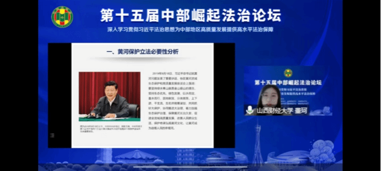 同时,董珂同学作为山西省获奖代表在本次论坛上进行交流发言,她围绕论文《习近平生态文明思想中的黄河保护法立法研究》,从黄河保护立法必要性分析、我国黄河流域立法现状分析、黄河保护立法应坚持的目标任务以及《黄河保护法》亮点及思考四部分进行了主旨发言,内容丰富,图文并茂,圆满完成任务!