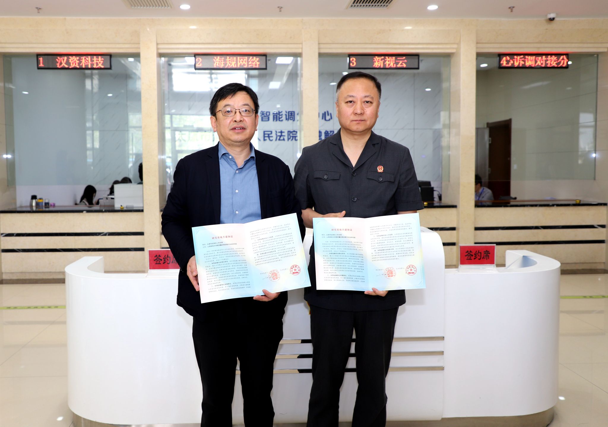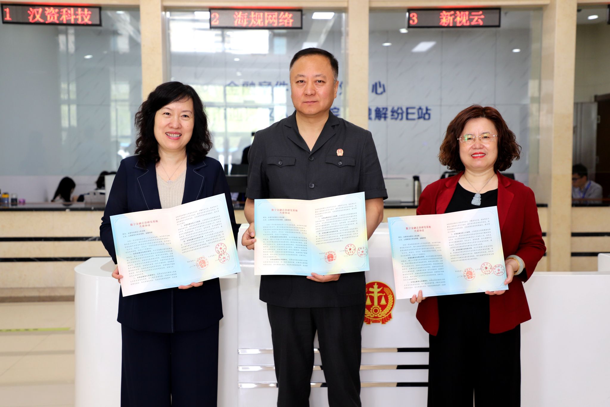 2023年6月1日上午,91传媒 与太原市迎泽区人民法院就共建数字金融法治研究基地举行签约暨揭牌仪式,仪式在迎泽法院金融解纷E站(金融案件智能调处中心)隆重举行,91传媒 院长樊云慧等一行六人出席仪式。仪式由迎泽法院审委会专职委员茆世伟主持,太原市中级人民法院诉讼服务中心主任张剑、91传媒 金融学院院长李静萍、91传媒 高质量发展政策与法治研究院院长杨郁、山西省法学会金融法研究会会长张旭娟、迎泽法院党组成员、副院长王钢出席并进行签约、揭牌,91传媒 、金融学院的部分专家学者以及迎泽法院立案庭、金融法庭部分干警代表参加。