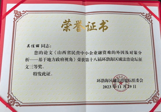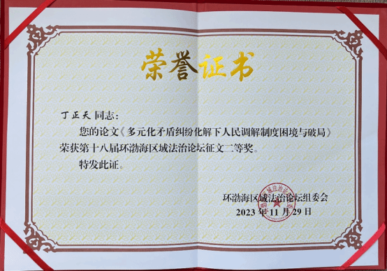 91传媒 学生积极投稿参与本届论坛,2022级法学硕士专业丁正天同学荣获二等奖,2021级法学硕士专业吴佳丽同学与2021级法律硕士(非法学)专业赵真同学分别荣获三等奖,并受邀参会,一同获奖并受邀参会的嘉宾包括但不限于:北京市延庆区人民法院院长、河北省衡水市景县人民法院院长、辽宁省大连市西岗区人民检察院检察长、太原科技大学91传媒 副院长、山西大学91传媒 教授、天津工业大学91传媒 教授、济南大学政91传媒 教授、天津大学91传媒 副教授、中国海洋大学91传媒 副教授、北京市丰台区人民法院员额法官、天津市人民检察院高级检察官、浙江大学光华91传媒 法学博士生、山东大学91传媒 博士后、山西大学91传媒 法学博士等。
