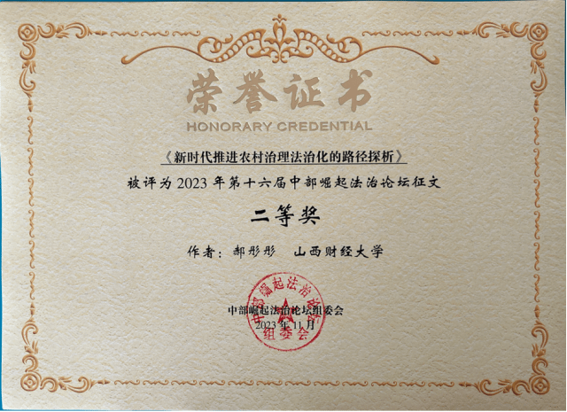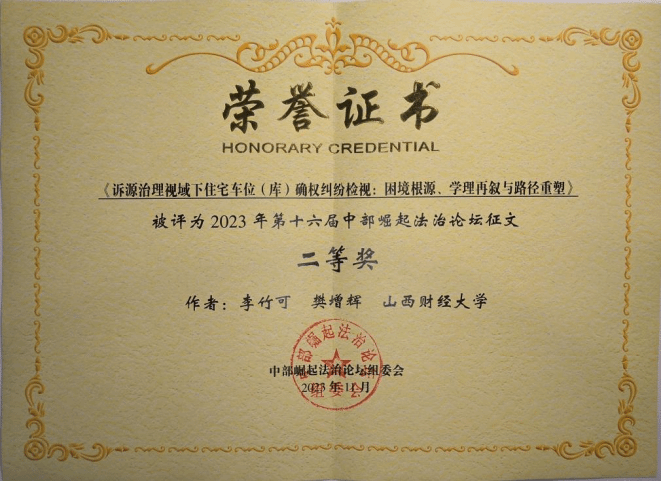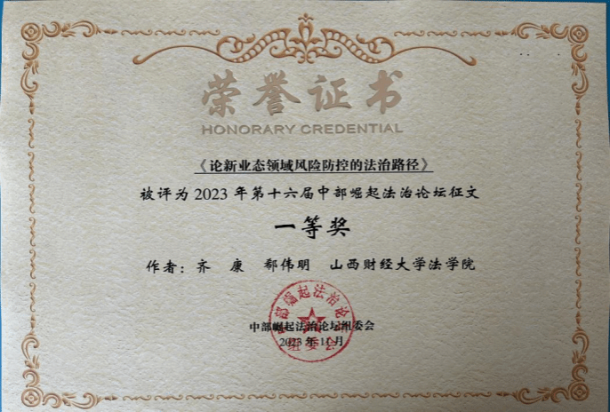 在论坛的征文活动中,学院2022级法学硕士齐康与其导师郗伟明教授合作撰写的论文《论新业态领域风险防控的法治路径》荣获一等奖,2022级法学硕士李竹可、樊增辉合作完成的论文《诉源治理视域下住宅车位(库)确权纠纷检视:困境根源、学理再叙和路径重塑》和2022级法学硕士郝彤彤的论文《新时代推进农村治理法治化的路径探析》荣获二等奖,2022级法律(非法学)硕士姬静茹的论文《平台自我优待行为的反垄断规制路径探析》荣获三等奖。2022级博士研究生靳彤彤、2023级法学硕士研究生高玮荣、2022级法律硕士(非法学)研究生获优秀奖。学院获第十六届中部崛起法治论坛征文“优秀组织奖”。