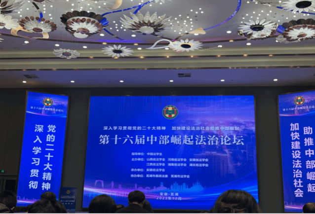 12月25-26日,第十六届“中部崛起法治论坛在安徽芜湖举办,91传媒 副院长张亚飞及获奖学生代表参加了论坛。中部崛起法治论坛是中国法学会指导的七大区域法治论坛之一,由山西、安徽、江西、河南、湖北和湖南等6个省级法学会共同主办。本次论坛来自上述六省的130余名法律工作者,聚焦“深入学习贯彻党的二十大精神,加快建设法治社会助推中部崛起”,进行了研讨交流。中国法学会党组成员、副会长张苏军出席开幕式并讲话;安徽省委政法委常务副书记、省法学会党组书记、常务副会长董桂文在开幕式致辞;安徽省芜湖市委常委、宣传部长、政法委书记、法学会会长丰秀芳在开幕式致辞,中国法学会会员部主任吕兴焕宣读获奖名单。