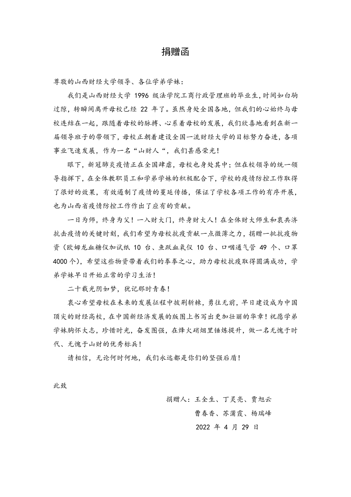 新冠无情,母校恩深。捐赠前期,校友提前和学校联系,了解到学校抗疫工作紧缺的物资,六位校友慷慨解囊,共同出资购买了欧姆龙血糖仪加试纸10套、鱼跃血氧仪10台、口咽通气管49个、口罩4000个。在全体山财师生和衷共济抗击疫情的关键时刻,捐赠给学校紧缺物资,助力母校疫情防控工作,为学弟学妹送来了温馨关爱,为学校打赢抗疫阻击战提供了坚强保障。